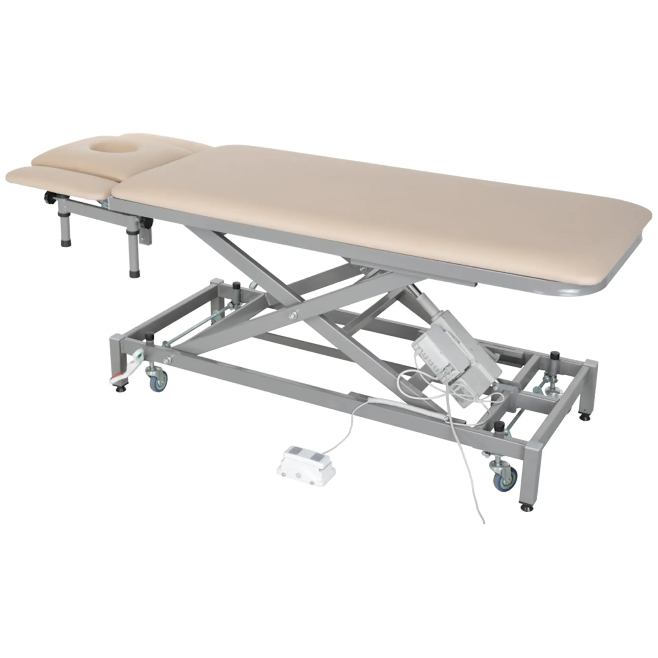 • массажный стол установлен на 4 регулируемые опоры с возможностью перехода на самоориентирующиеся колеса, ∅ 75 мм, из немаркой серой резины, не оставляющего следов на полу для перемещения стола;