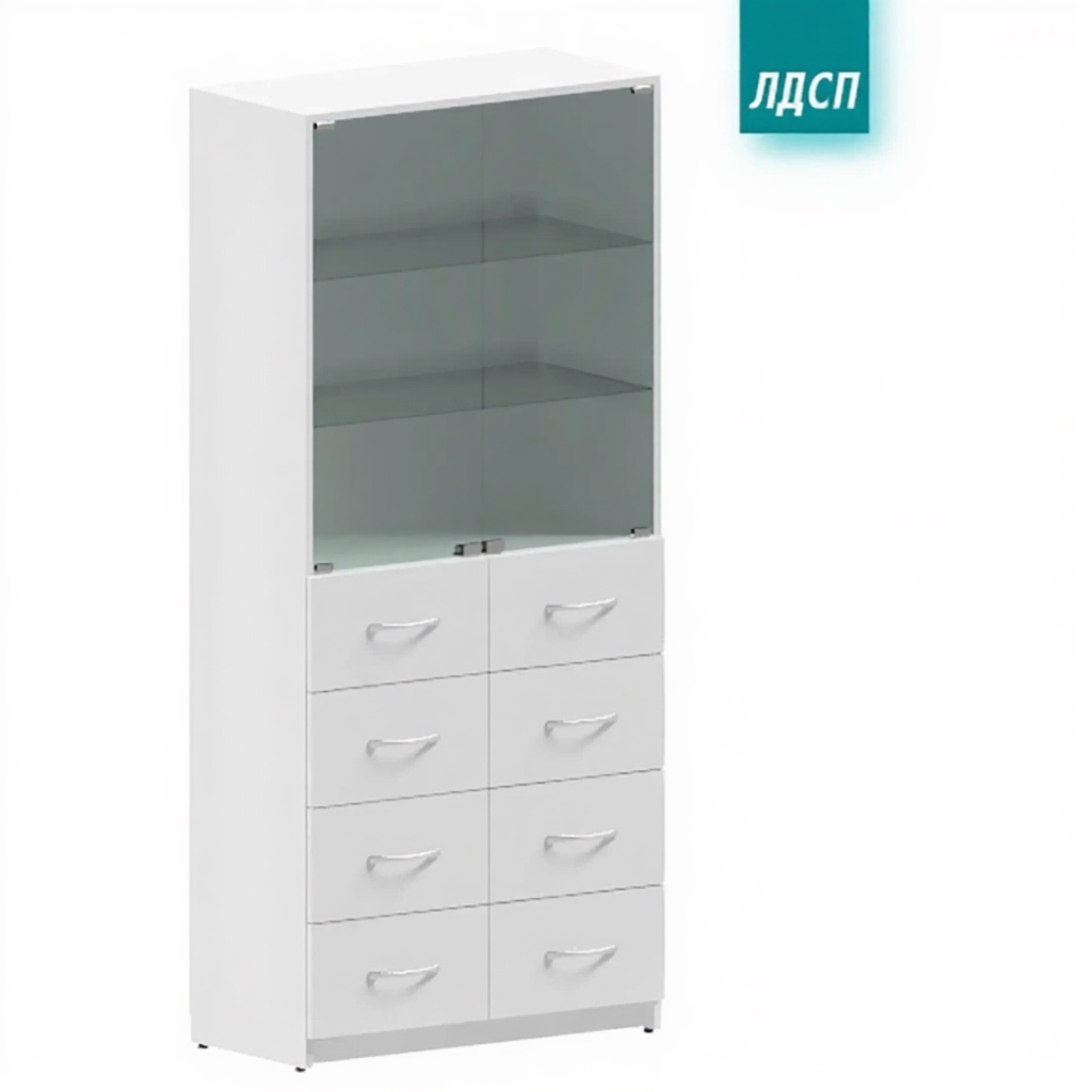 • Шкаф медицинский двухстворчатый со стеклянными дверями в верхней секции и ящиками в нижней секции;
