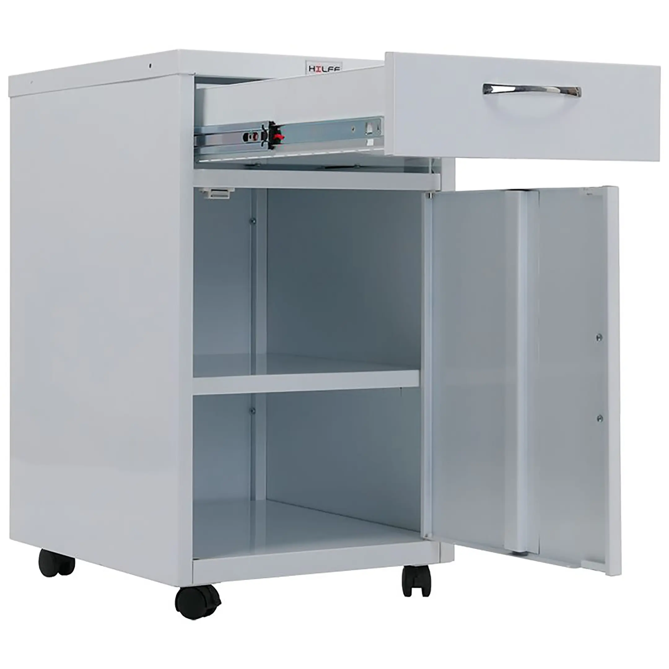 Опция: установка ключевого замка (2000 комбинаций), пластиковые опоры вместо колес, резиновые колеса. Окраска дверей, передних панелей ящиков или корпуса изделия полностью в другие цвета из палитры производителя - RAL 710-1, RAL 610-1 (при заказе от 70 штук).