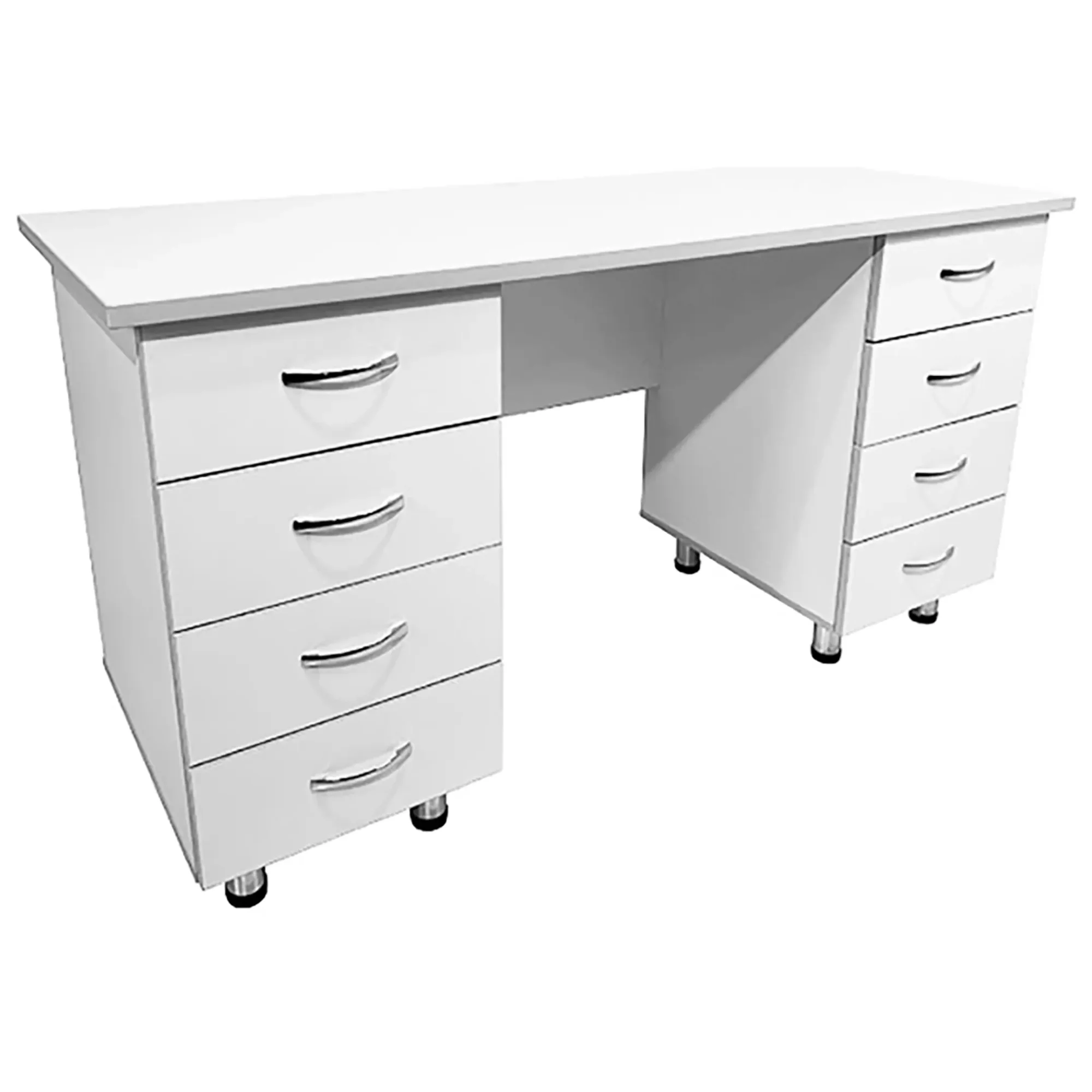 • Ключевая особенность данной модели - наличие двух боковых тумб, каждая из которых оснащена четырьмя выдвижными ящиками. Это предоставляет удобное и организованное хранение документов, инструментов и других необходимых материалов. Сочетание белого цвета ЛДСП с светло-серой кромкой создает стильный и современный внешний вид стола.