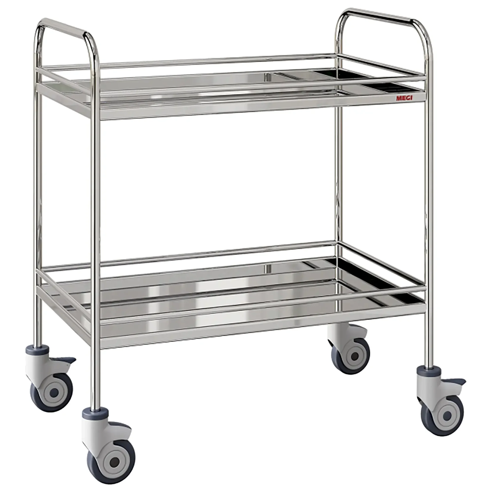• колеса поворотные, самоориентирующиеся, диаметром 100 мм, комплектются надёжной стальной вилкой с прецизионным радиально-упорным подшипником, ободом из полипропилена и шинкой из серого полиуретана, не оставляющего следов на полу, два колеса – с индивидуальным тормозным устройством;