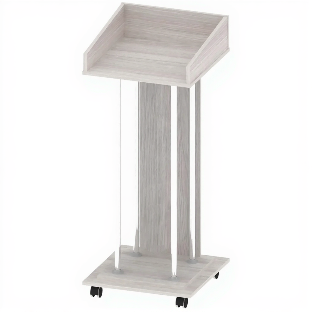 Трибуна ТР-ШП-5, Ясень Шимо Светлый — это современное и стильное решение для оснащения актовых залов, конференц-залов, учебных аудиторий и лекционных помещений. Модель выполнена из высококачественного ЛДСП 16 мм в цвете Ясень Шимо Светлый с хромированными трубами, что обеспечивает прочность, надежность и презентабельный внешний вид. Все торцы деталей обработаны кромочной лентой ПВХ 2 мм для защиты от сколов и влаги. Трибуна состоит из основания, стойки и подставки. Подставка расположена под прямым углом к стойке и имеет бортики высотой 150 мм, которые предотвращают падение документов и материалов. Трибуна оснащена колесными опорами со стопором, что позволяет легко перемещать ее и надежно фиксировать на месте во время выступления.