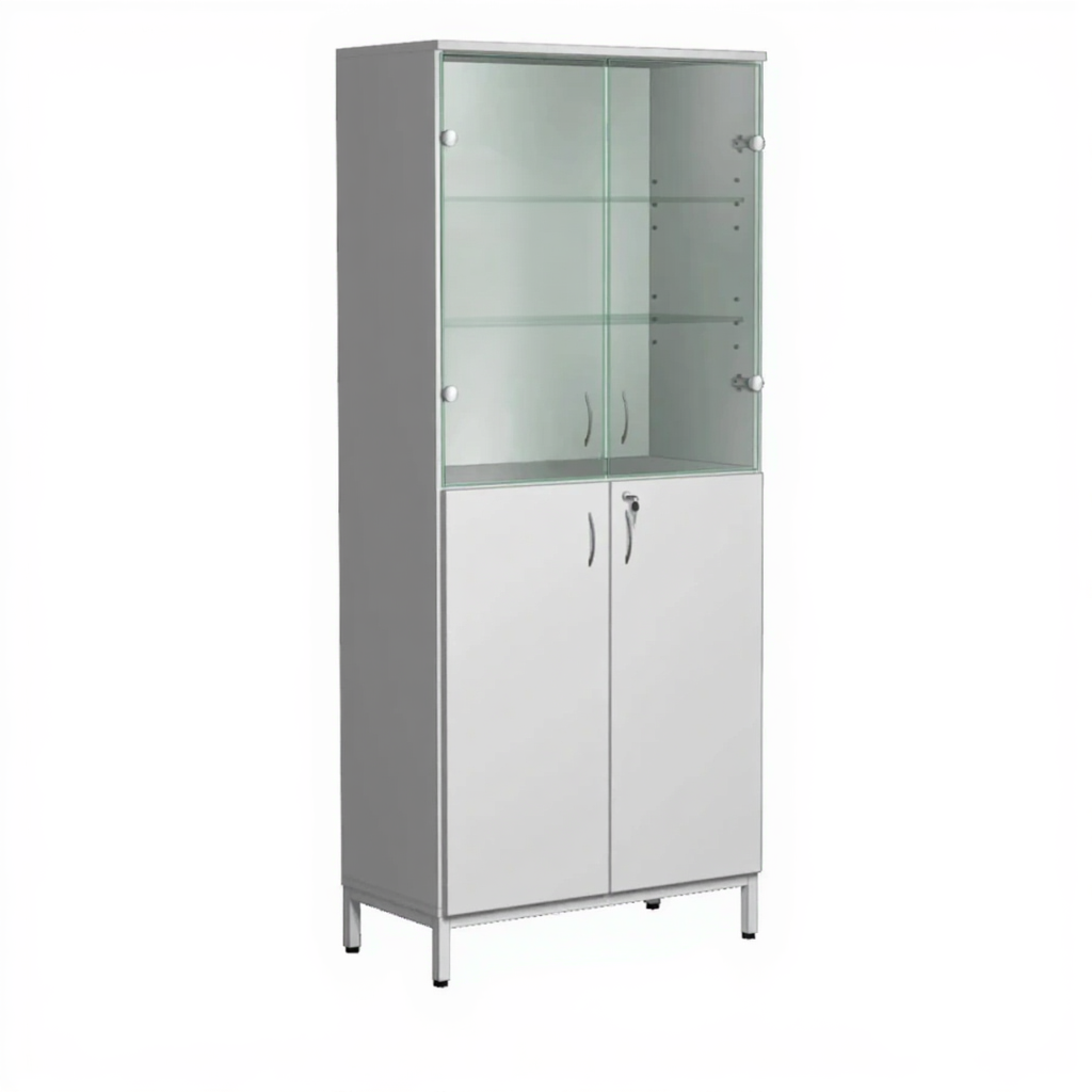 - Комбинированная конструкция — верхняя секция со стеклянными дверками и полками для демонстрации и быстрого доступа, нижняя секция с закрытыми дверками и замком для безопасного хранения.
