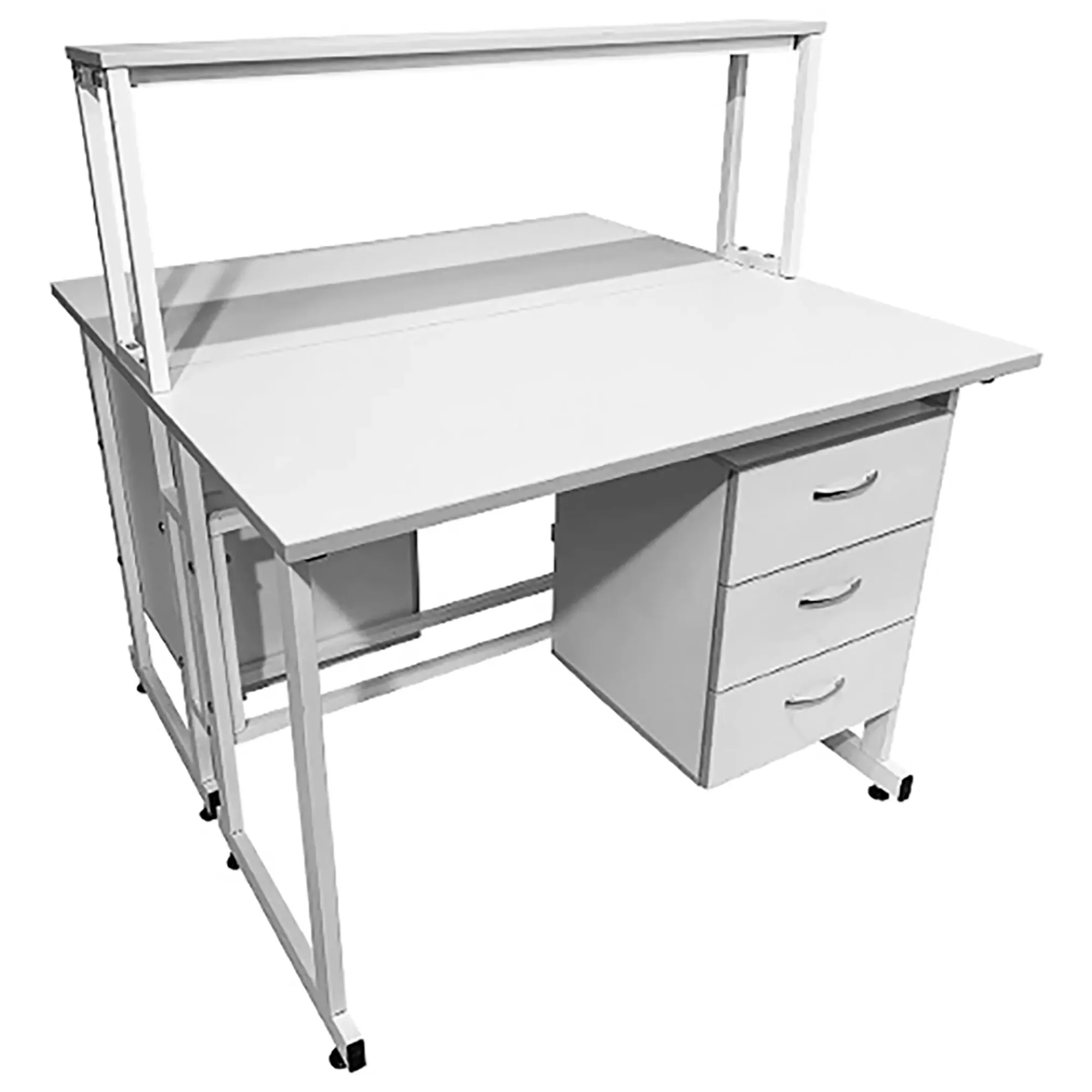 Стол лабораторный островной с надстройкой Сло 22.009 (белый) — это функциональное решение для организации двух независимых рабочих мест в лабораториях и медицинских учреждениях. Модель оснащена двумя рабочими местами, каждое с подвесной тумбой с тремя выдвижными ящиками, и центральной надстройкой с одной полкой. Каркас выполнен из стального профиля, столешницы из ЛДСП толщиной 22 мм.