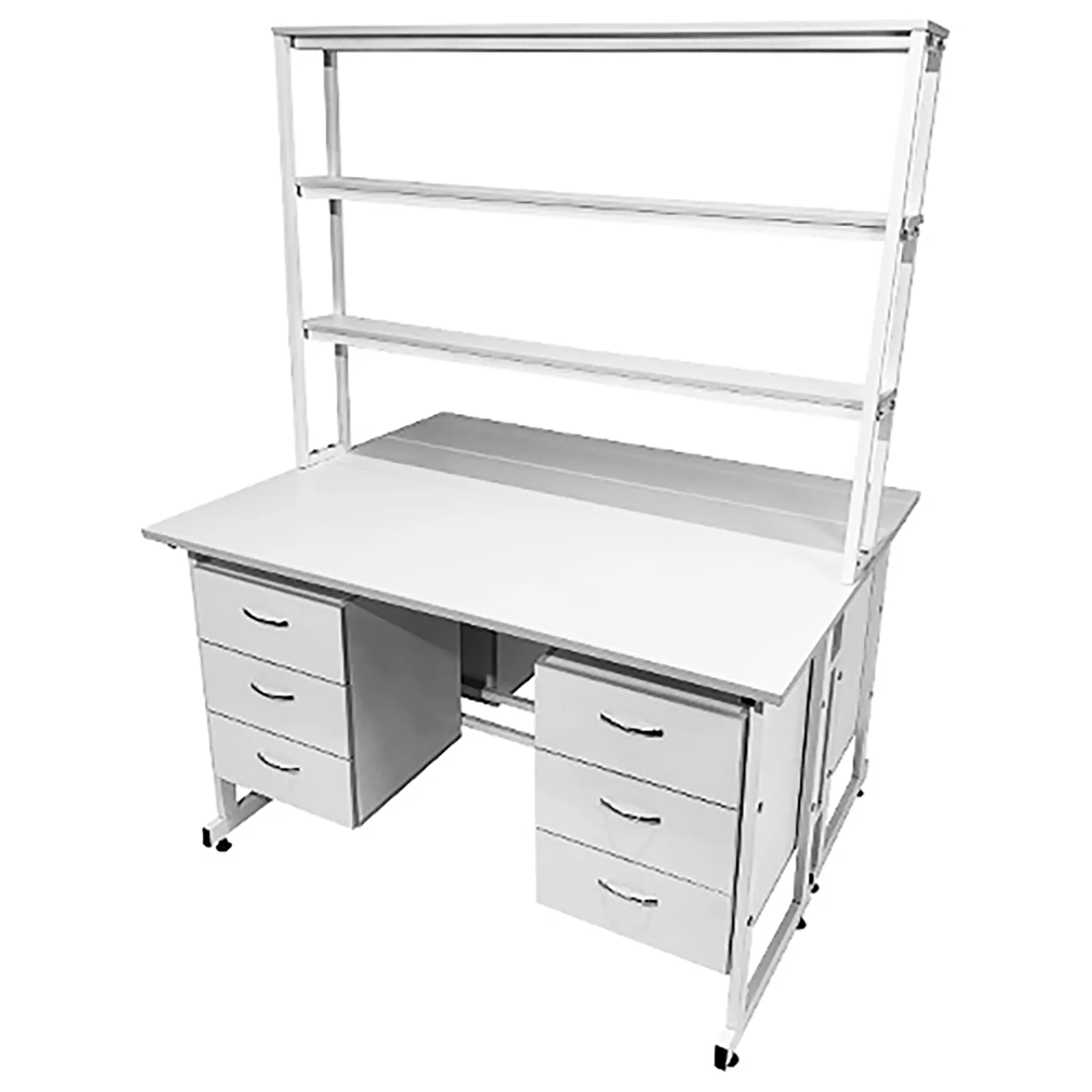 Стол лабораторный островной с надстройкой Сло 22.023 (белый) — это эффективное и удобное решение для организации двух рабочих мест в лабораториях или медицинских учреждениях. Модель оснащена двумя рабочими местами, каждое с двумя подвесными тумбами, имеющими три выдвижных ящика, и центральной надстройкой с тремя полками. Каркас выполнен из стального профиля, столешницы из ЛДСП толщиной 22 мм.