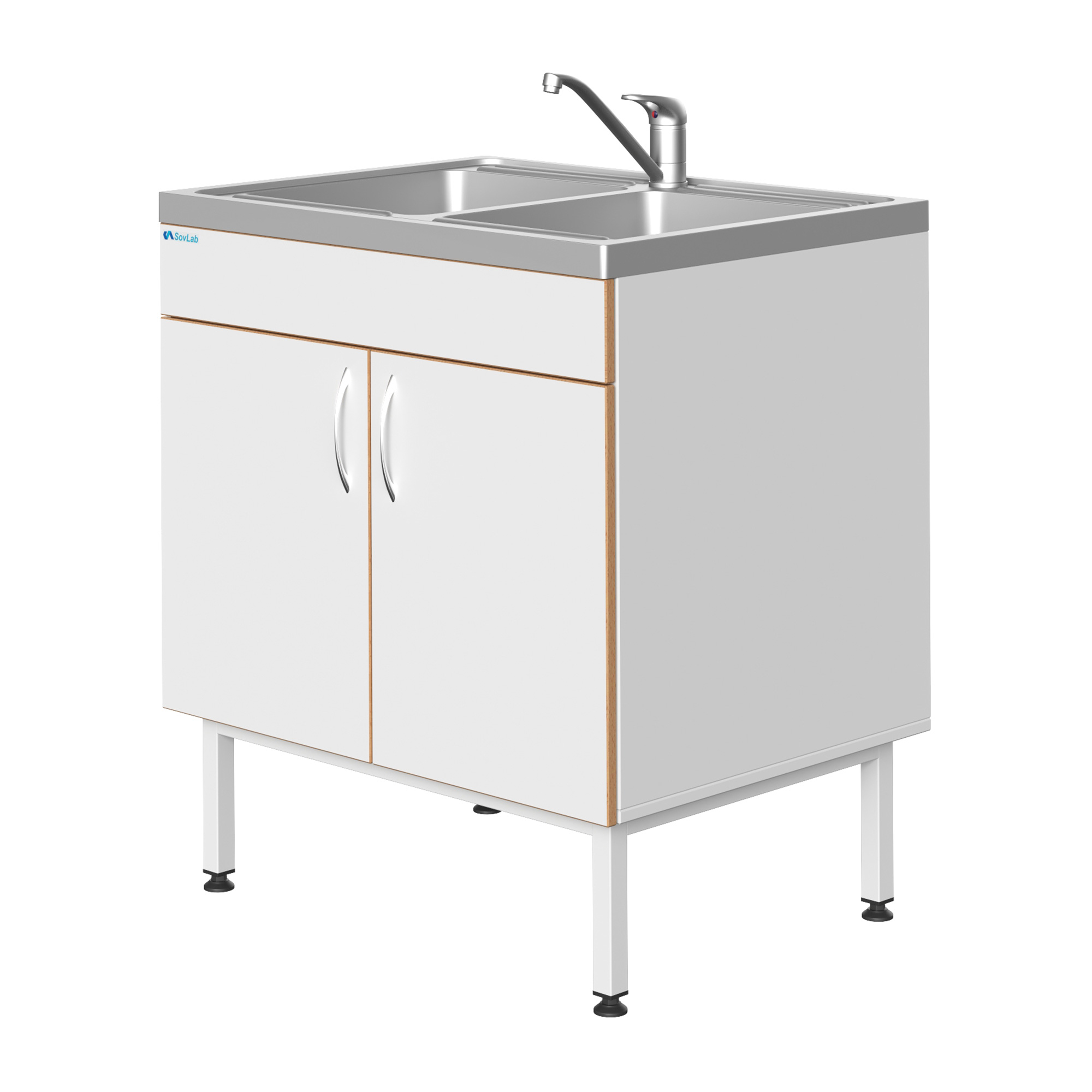 Мойка СОВЛАБ 800 НЖ-2, двойная — это компактное специализированное лабораторное оборудование, предназначенное для качественной и безопасной мойки лабораторной посуды, приборов и инструментов. Модель оснащена двумя чашами из нержавеющей стали, объединенными в единый блок со столешницей, смесителем и всей необходимой арматурой для подключения к инженерным сетям. Тумба из влагостойкого ДСП установлена на прочный металлический каркас с регулируемыми опорами.