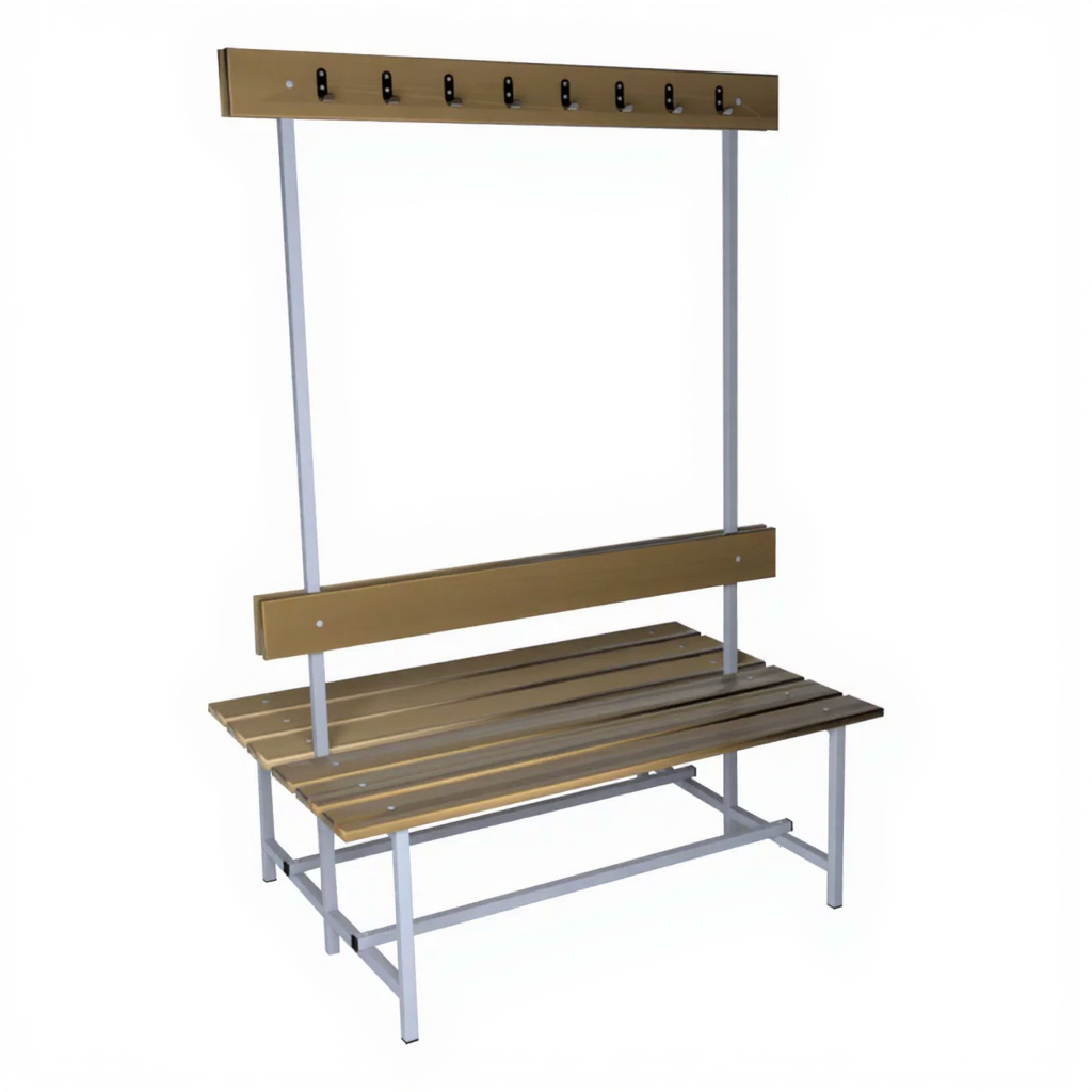 Скамья с вешалкой двухсторонняя 16 крючков — это надежное и функциональное решение для оборудования раздевалок, вестибюлей, гардеробных комнат в спортивных учреждениях, школах, производственных помещениях и т.п.