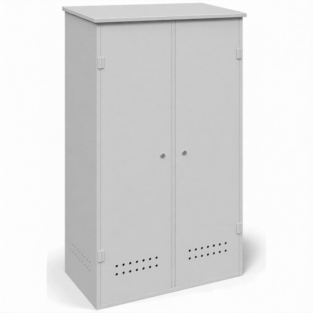 - Обеспечение требований пожарной безопасности — прочный металлический корпус служит эффективным барьером, изолирующим баллоны от возможных источников открытого огня, искр и тепла. Наличие системы приточно-вытяжной вентиляции (перфорация или вентиляционные решетки в верхней и нижней частях) обеспечивает постоянный воздухообмен, что критически важно для предотвращения образования взрывоопасной концентрации газа в случае утечки, в полном соответствии с ППР РФ.