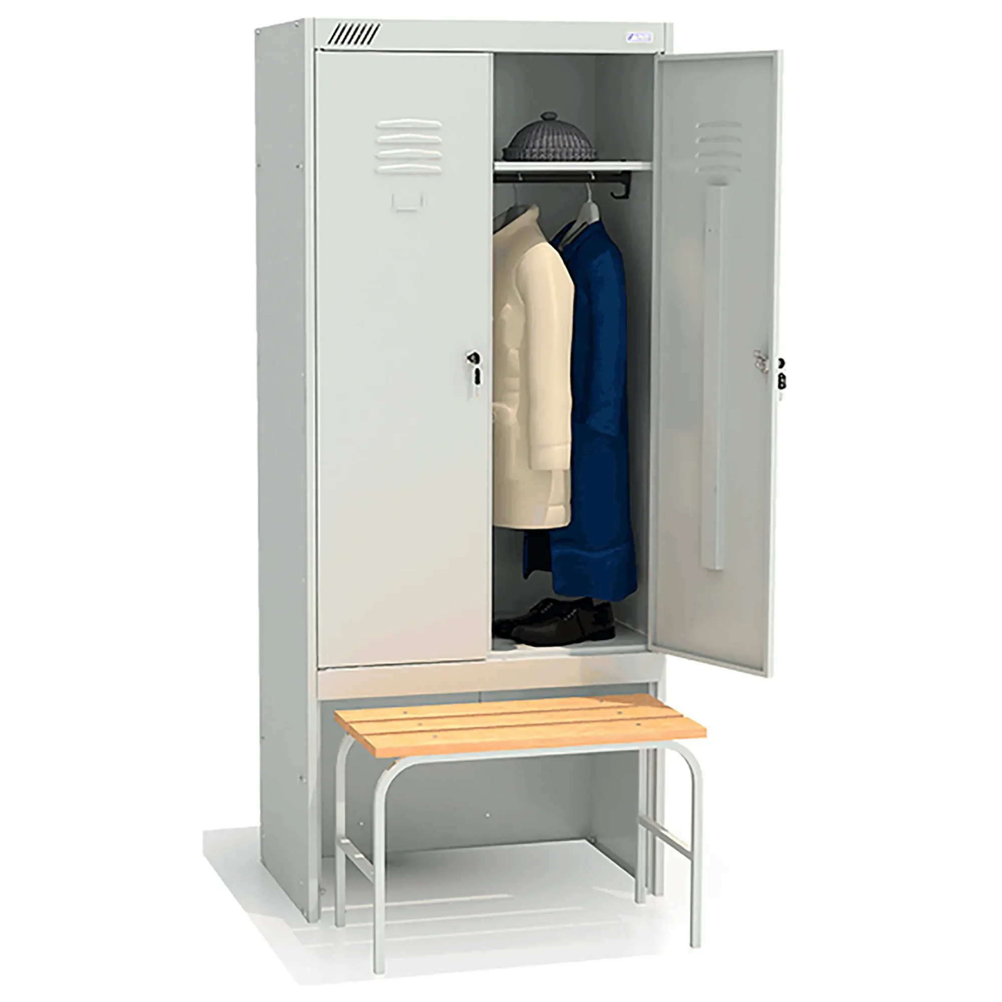 • комплектуется двумя замками повышенной секретности, двумя полками под головные уборы, двумя перекладинами, четырьмя крючками;