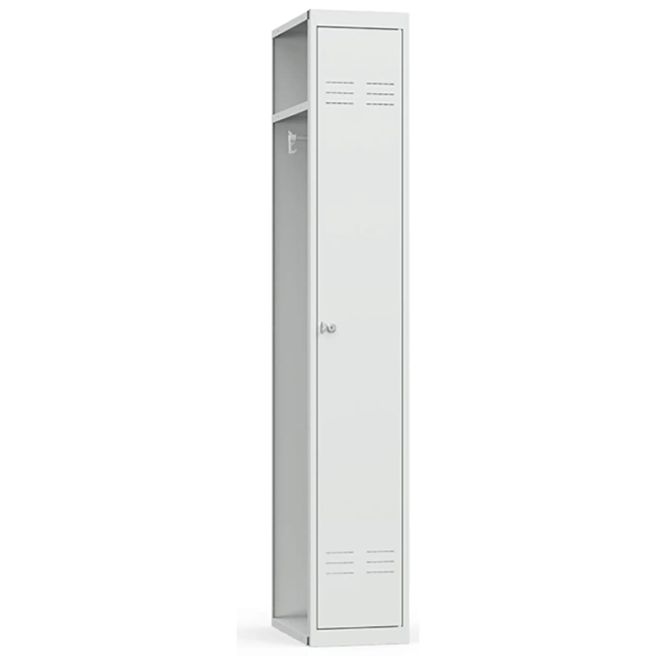 • Односекционный металлический шкаф для одежды имеет полную внутреннюю комплектацию: полку для головных уборов, пластиковые перекладины для вешалок и два крючка для одежды, проушина для навесных замков;