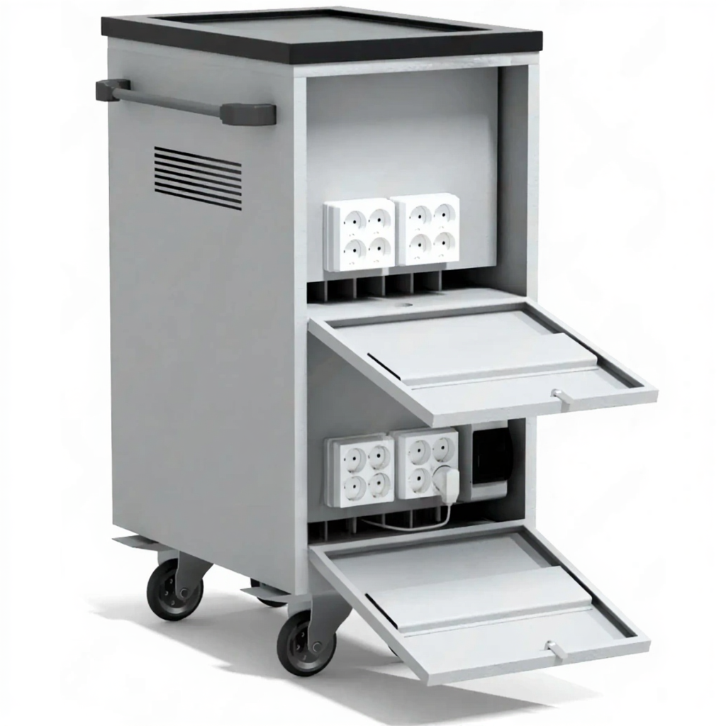 - Экономия времени и простота обслуживания — полностью устраняет проблему поиска свободных розеток и отслеживания заряда каждого ноутбука. Администратору или преподавателю достаточно подключить тележку к сети для гарантированной зарядки всего комплекта.