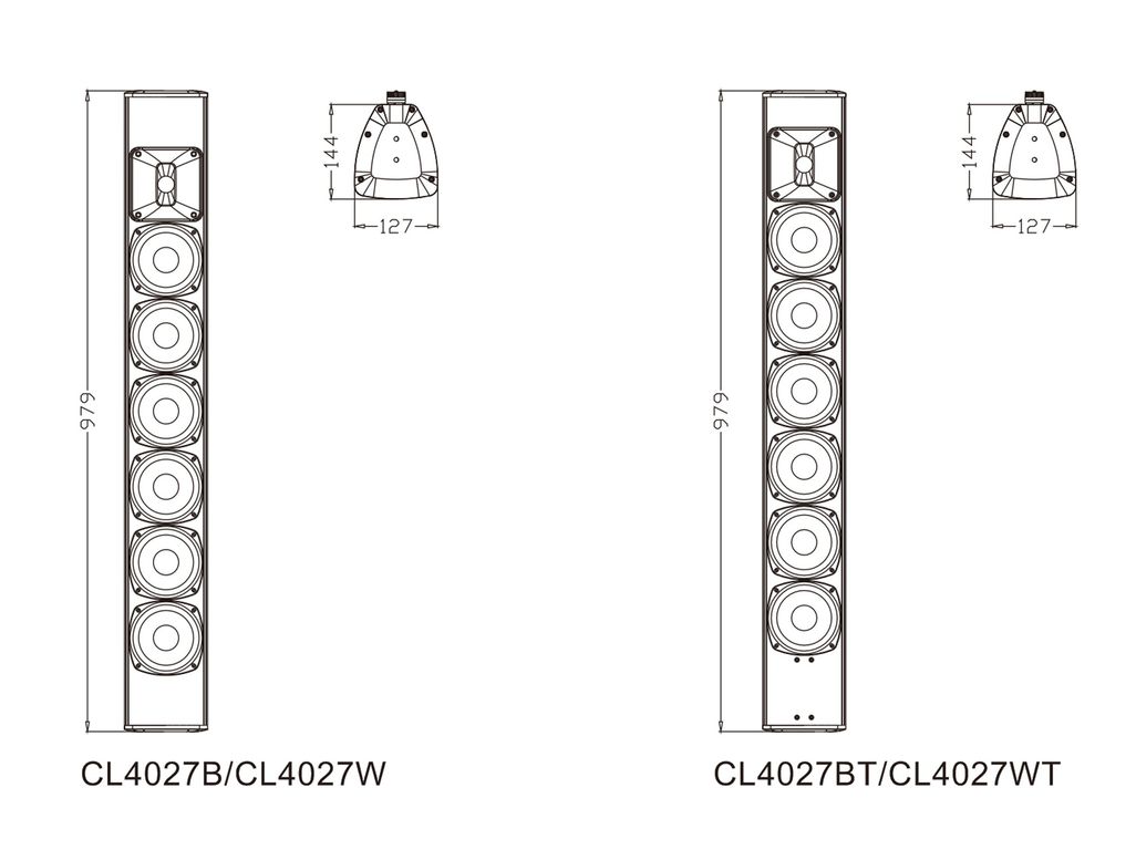 Серия CL4027 представляет собой акустическую систему колонного типа с различными цветами и функциями. Продукт соответствует стандарту IP56. Звук мягкий и сбалансированный. Корпус изготовлен из алюминиевого сплава. Буквы B и W после модели обозначают черный и белый цвет соответственно, а буква T представляет собой конфигурацию с трансформатором.